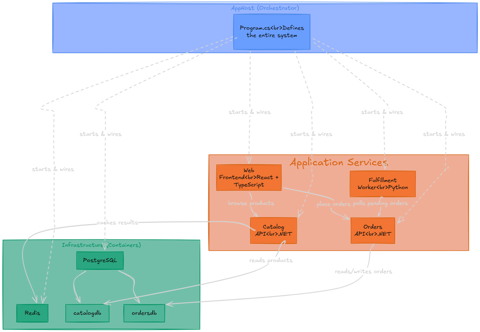 Aspire solves this by giving you a single place to describe your entire system: the AppHost.