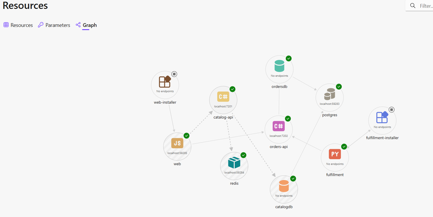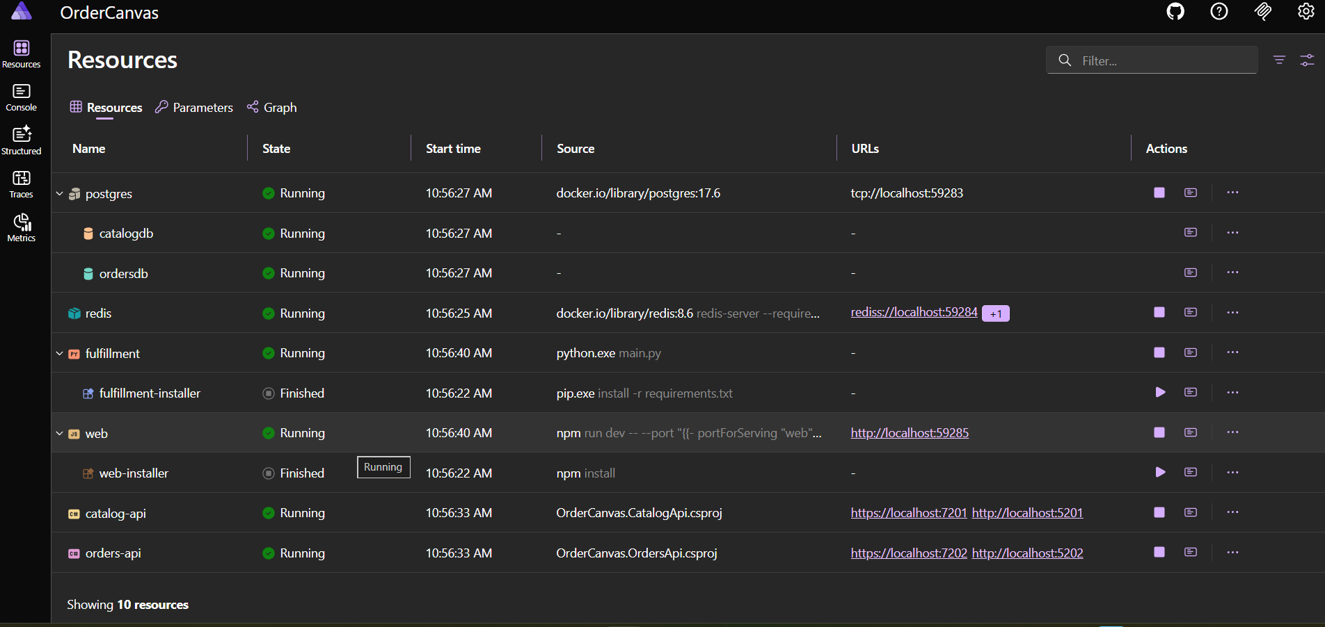 var builder = DistributedApplication.CreateBuilder(args); // Infrastructurevar postgres = builder.AddPostgres("postgres");var catalogDb = postgres.AddDatabase("catalogdb");var ordersDb = postgres.AddDatabase("ordersdb");var redis = builder.AddRedis("redis"); // .NET APIsvar catalogApi = builder.AddProject<Projects.OrderCanvas_CatalogApi>("catalog-api") .WithReference(catalogDb) .WithReference(redis) .WaitFor(catalogDb) .WaitFor(redis); var ordersApi = builder.AddProject<Projects.OrderCanvas_OrdersApi>("orders-api") .WithReference(ordersDb) .WaitFor(ordersDb); // React Frontendbuilder.AddViteApp("web", "../ordercanvas-web") .WithReference(catalogApi) .WithReference(ordersApi) .WaitFor(catalogApi) .WaitFor(ordersApi); // Python Workerbuilder.AddPythonApp("fulfillment", "../ordercanvas-fulfillment", "main.py") .WithReference(ordersApi) .WaitFor(ordersApi); builder.Build().Run();