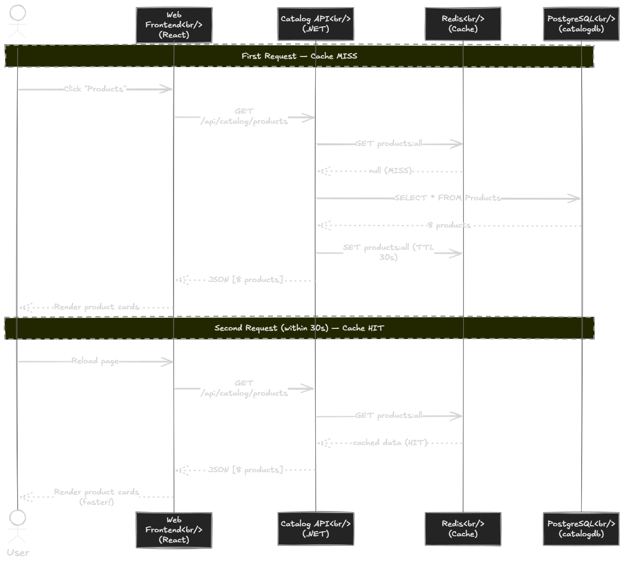 • Catalog API (.NET) - serves product data from PostgreSQL with Redis caching