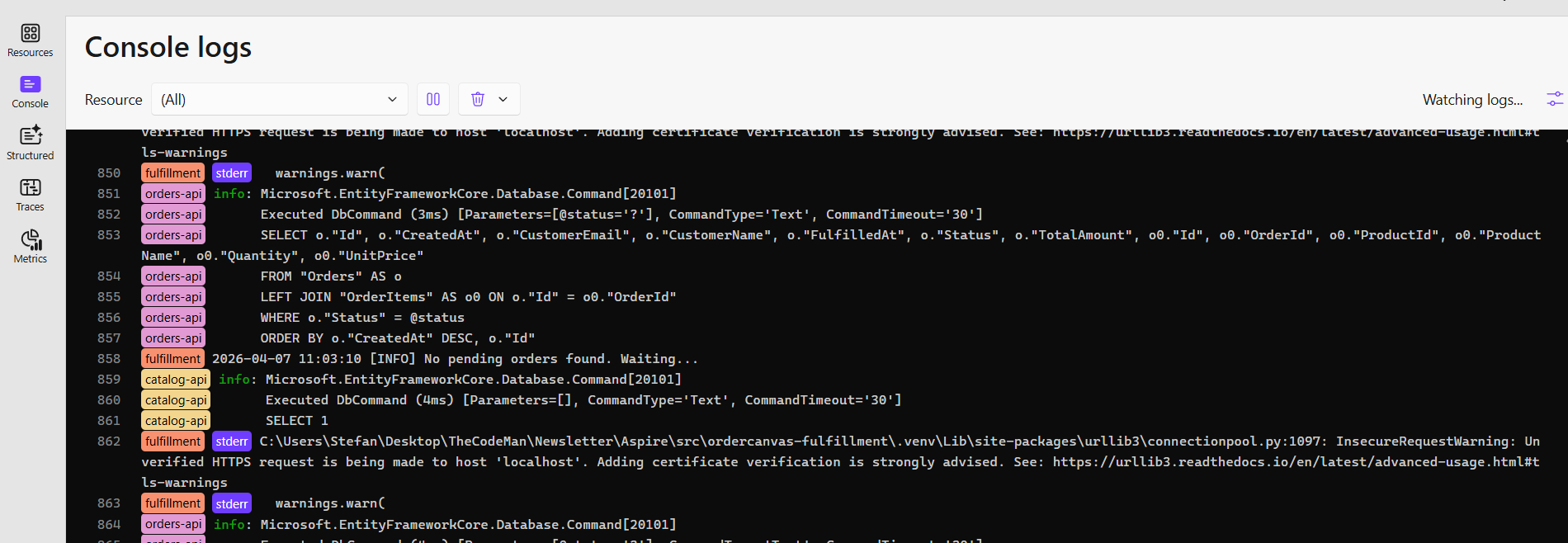 For non-.NET services, Aspire is smart about it too. The Python worker in OrderCanvas gets OTEL_EXPORTER_OTLP_ENDPOINT injected automatically as an environment variable - no Python-side configuration needed. Aspire captures its structured stdout logs and shows them in the same dashboard alongside the .NET services.