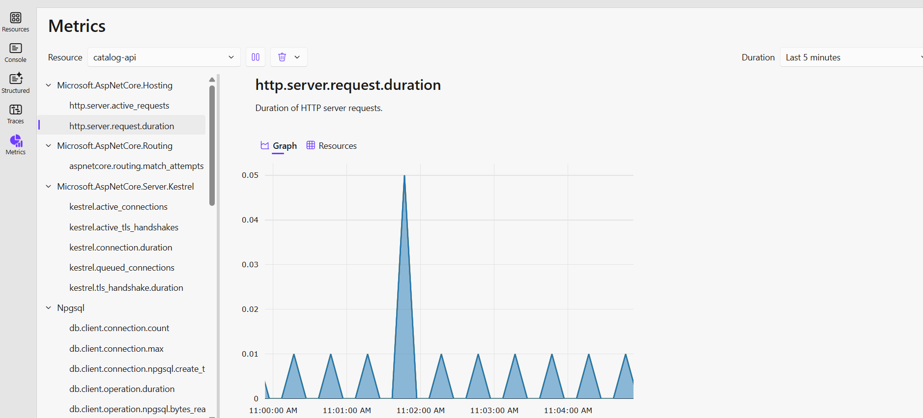 In the Aspire Dashboard you'll see the full trace: web → catalog-api → Redis (GET) → PostgreSQL (SELECT) → Redis (SET). On cache hit, the trace is shorter - it stops at Redis with no PostgreSQL step. You can see this difference visually, in real time.
