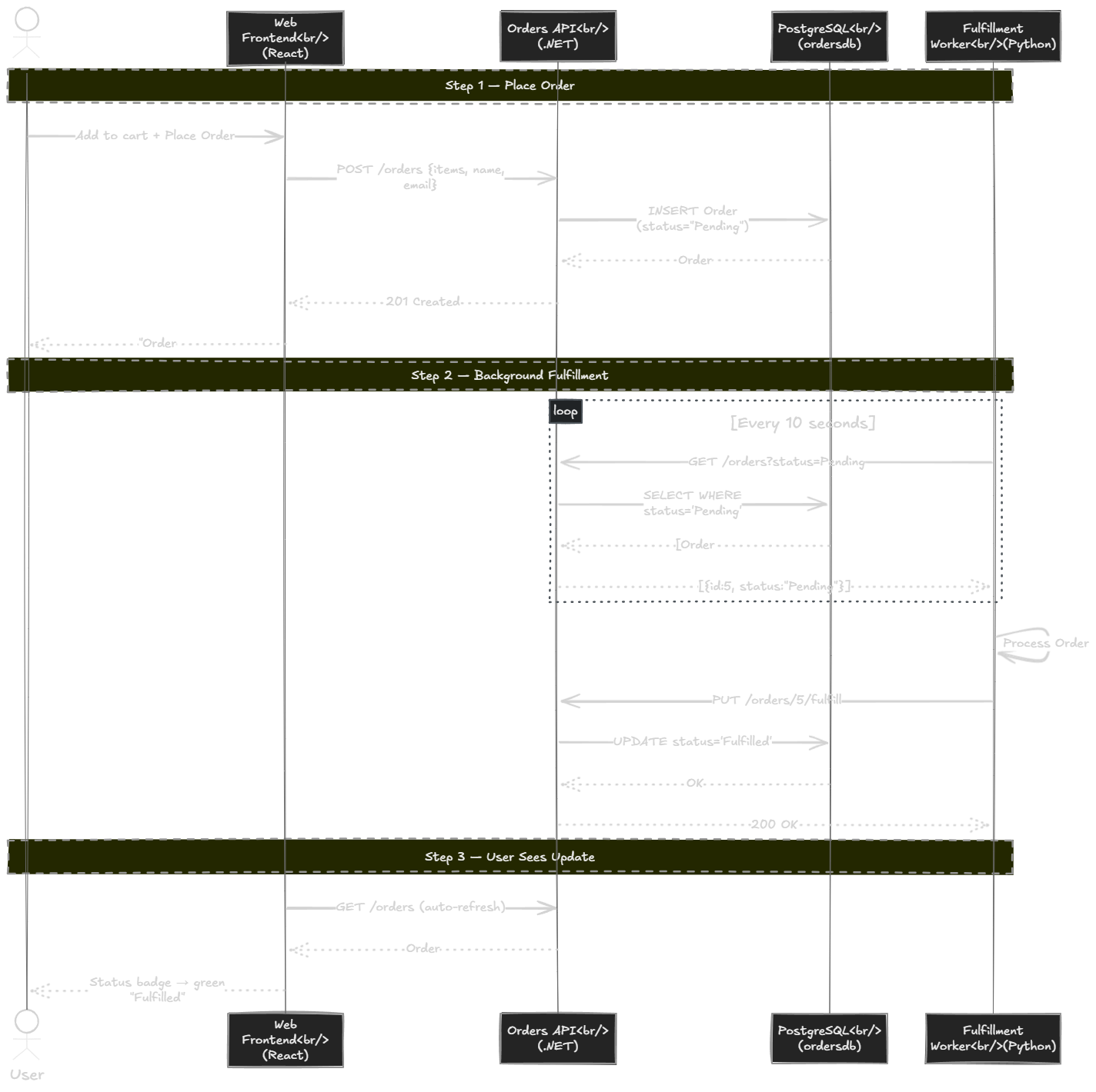 • Fulfillment Worker (Python) - background service that processes pending orders