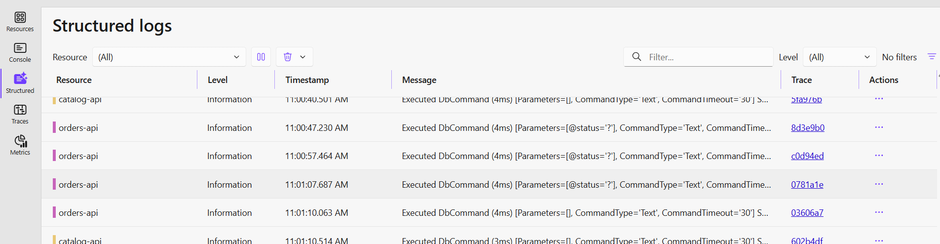 • logs from ALL services in one view, filterable by service Aspire Dashboard Structured Logs