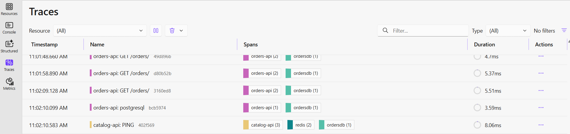 All of that is automatically pointed at the Aspire Dashboard. No separate collector. No Jaeger container. No Grafana stack.