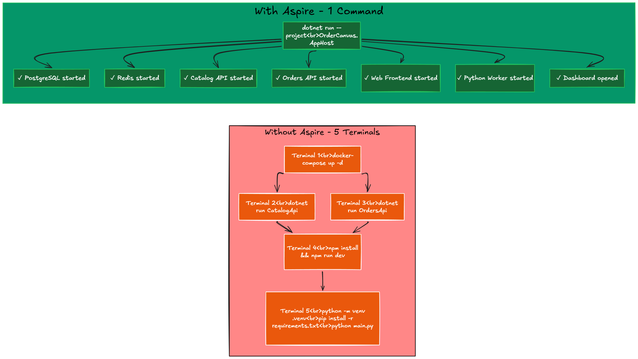 The key point: this entire flow involves 3 different languages and 4 different services (React → .NET Catalog API → .NET Orders API → Python Worker), all started from one command, all visible in one dashboard. That's the promise of Aspire - and OrderCanvas is the proof that it delivers.
